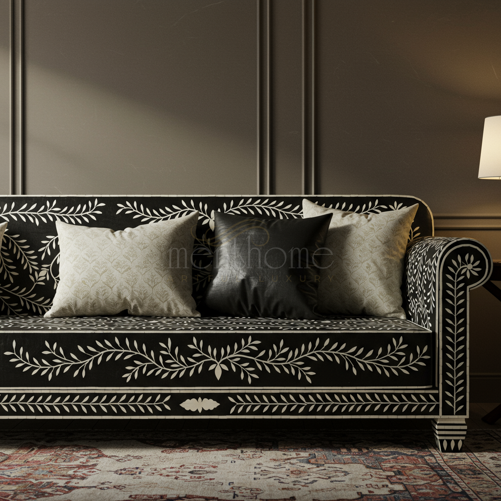 This luxurious inlay sofa showcases exquisite craftsmanship with its intricate ivory vine and leaf patterns set against a rich black background. Featuring a comfortable seating area complemented by a mix of textured cushions, it adds both elegance and comfort to any living space.