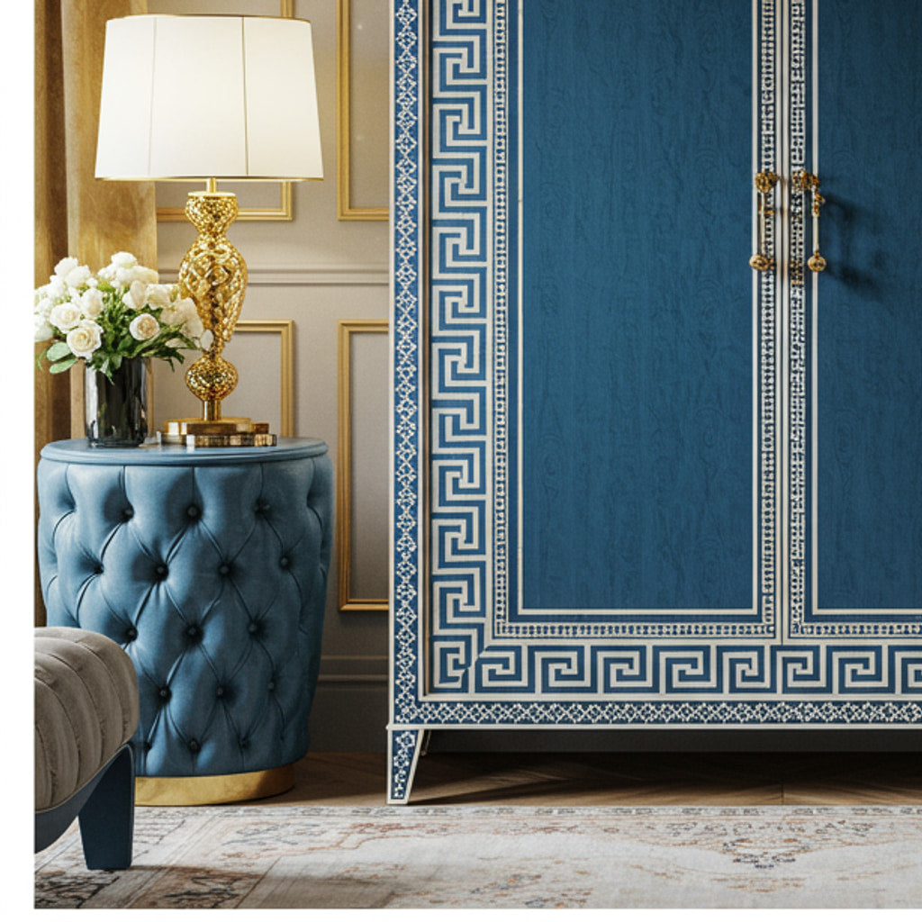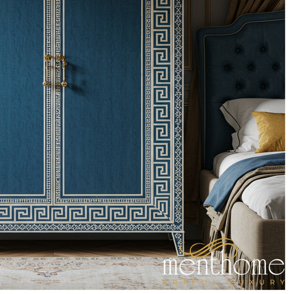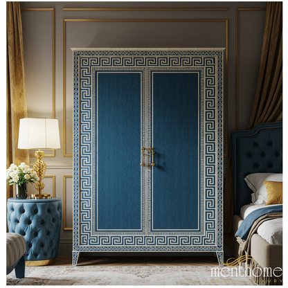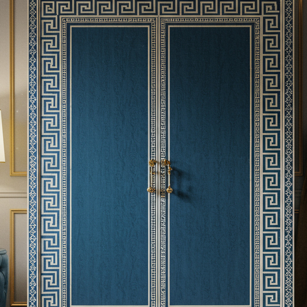 خزانة ملابس فاخرة بلمسة زرقاء راقية وحواف بيضاء مزخرفة بنقشة مفاتيح يونانية معقدة. مصممة لإضفاء لمسة من الأناقة والعملية على غرفة نومك بجمالها الأنيق والخالد.
