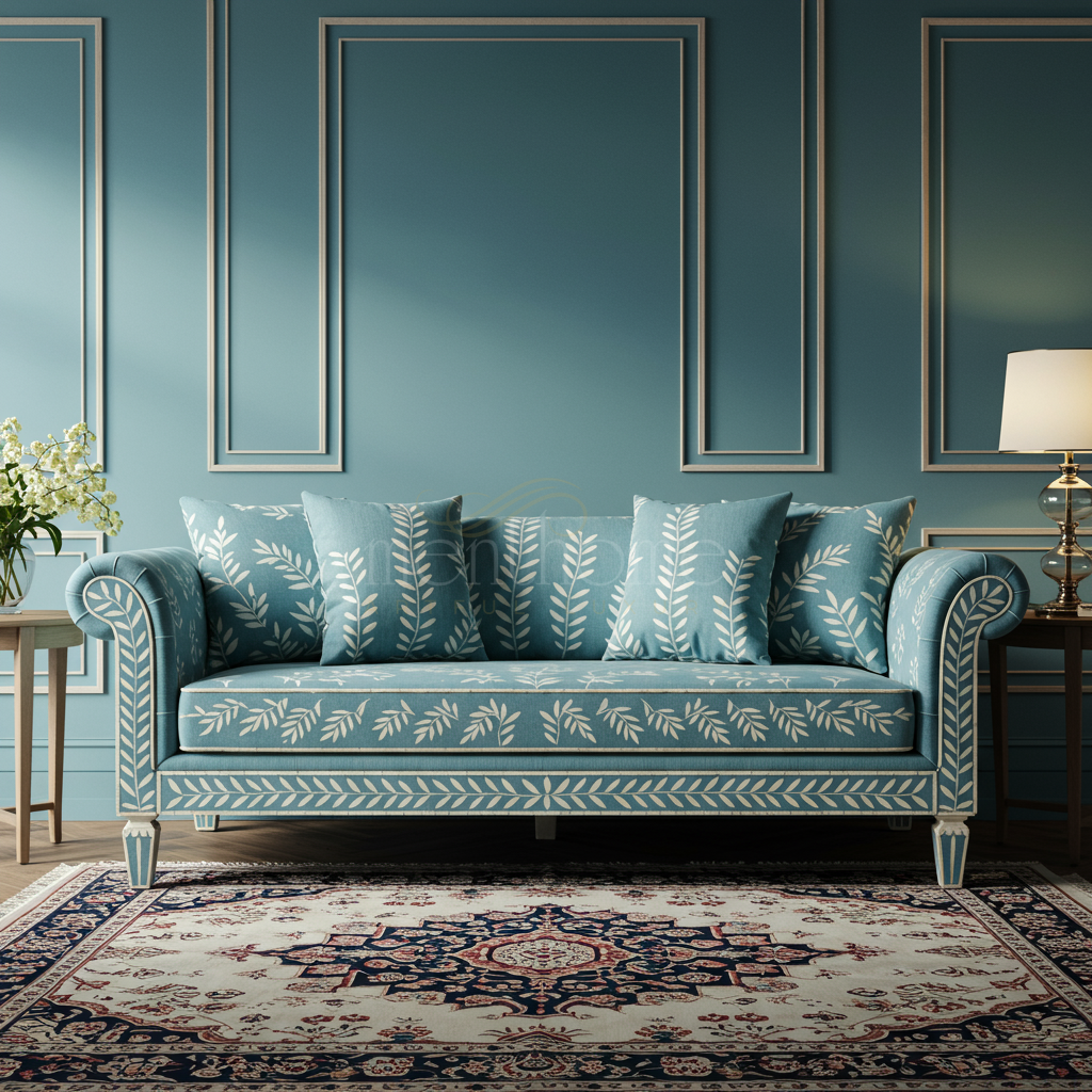 Elegant Blue Inlay Sofa with Leaf Pattern | Luxury Handmade Sofa