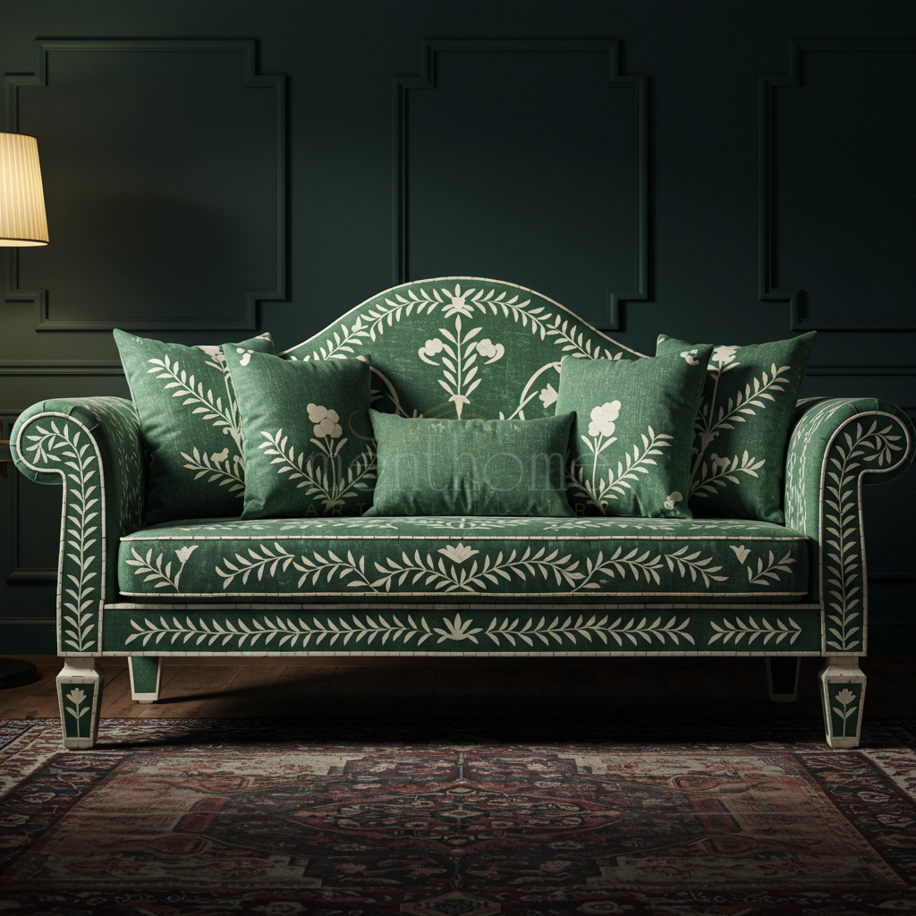 Elegant Green Inlay Sofa with Floral Motif | Luxury Handmade Sofa