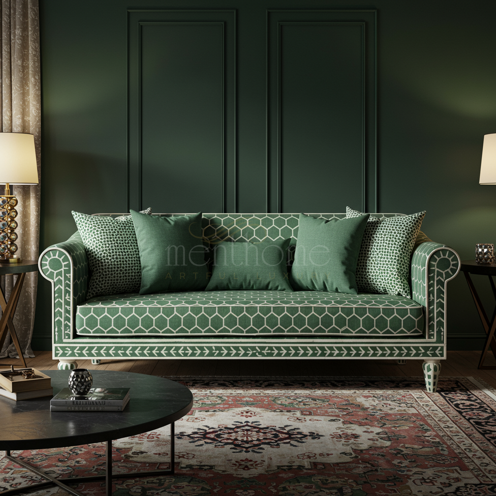 Elegant Green Inlay Sofa with Geometric Patterns | Luxury Handmade Sofa