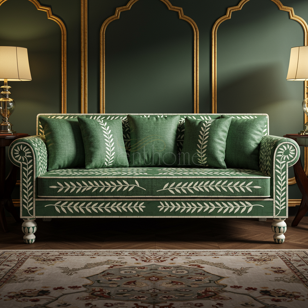 This exquisite green sofa features intricate white inlay work in a classic leaf motif, reflecting timeless elegance and artisanal craftsmanship. Perfectly upholstered with soft cushioning, the sofa offers both comfort and style, making it an ideal centerpiece for luxurious living spaces.