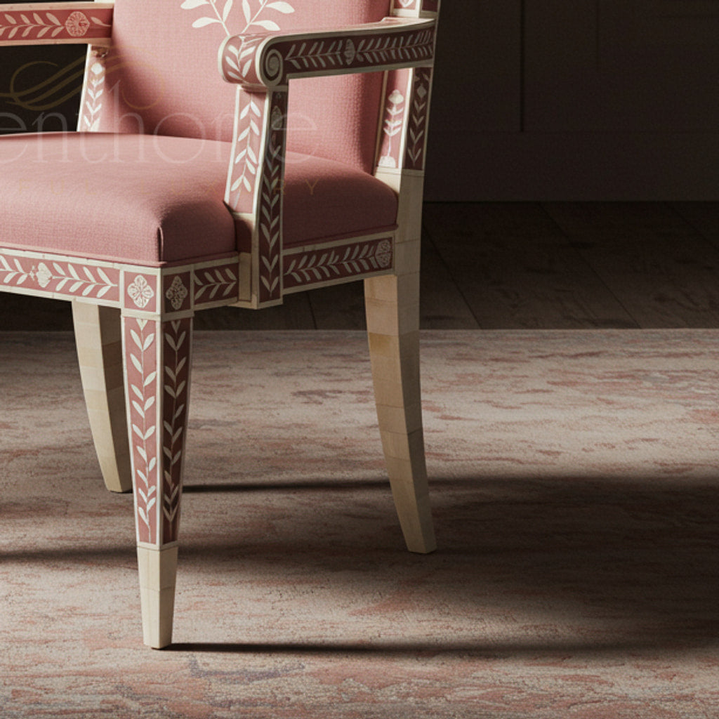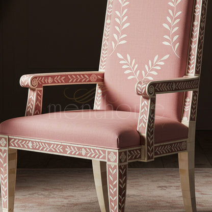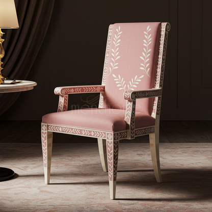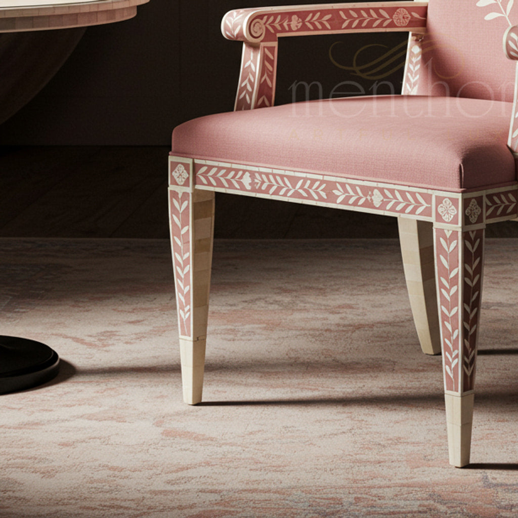 This luxury Inlay Armchair features exquisite hand-crafted inlay details with a soft pink fabric upholstery. Designed with intricate vine and leaf motifs on the wooden frame and arms, it embodies timeless elegance perfect for sophisticated living and seating areas.