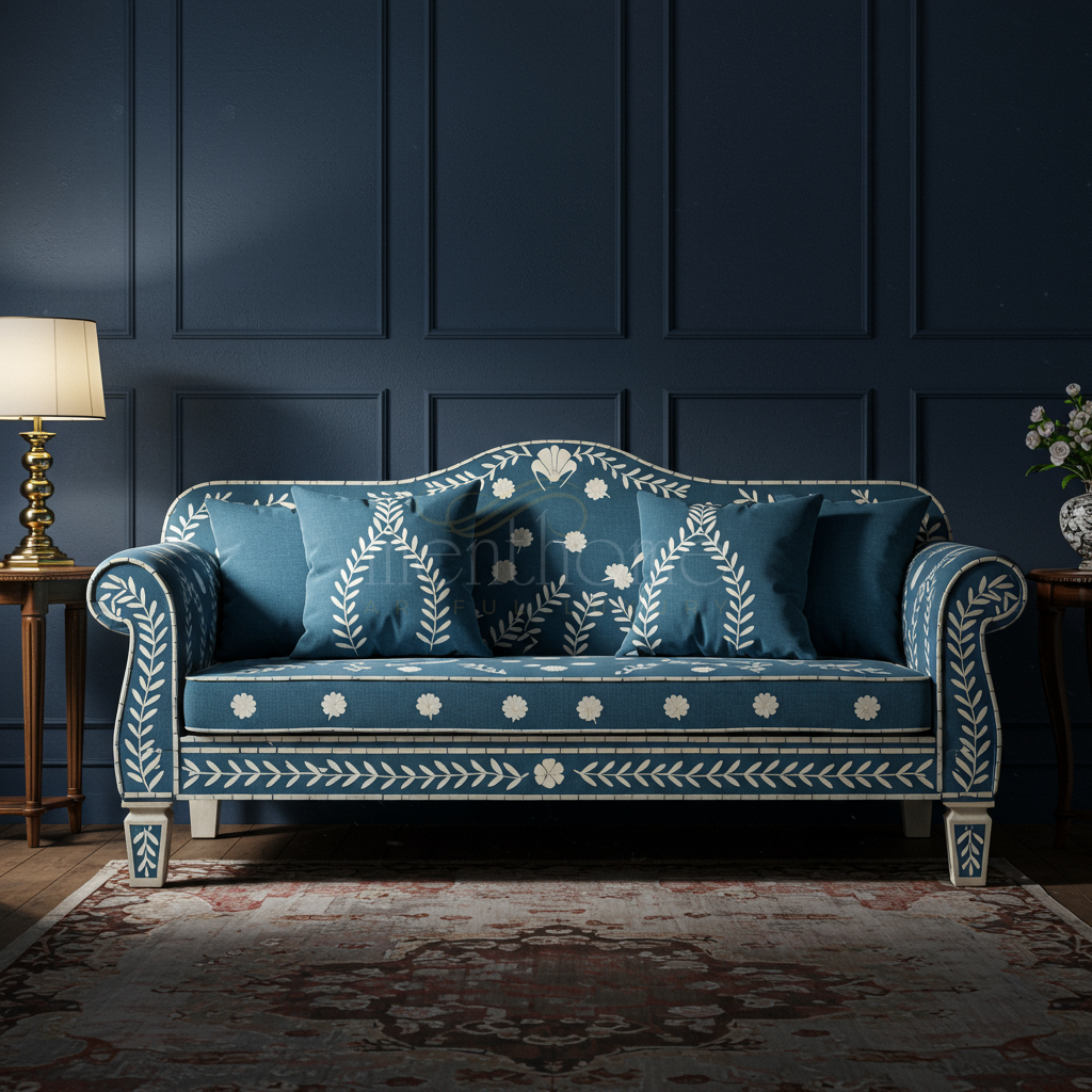 Elegant Inlay Blue Floral Pattern Sofa | Luxury Handmade Sofa