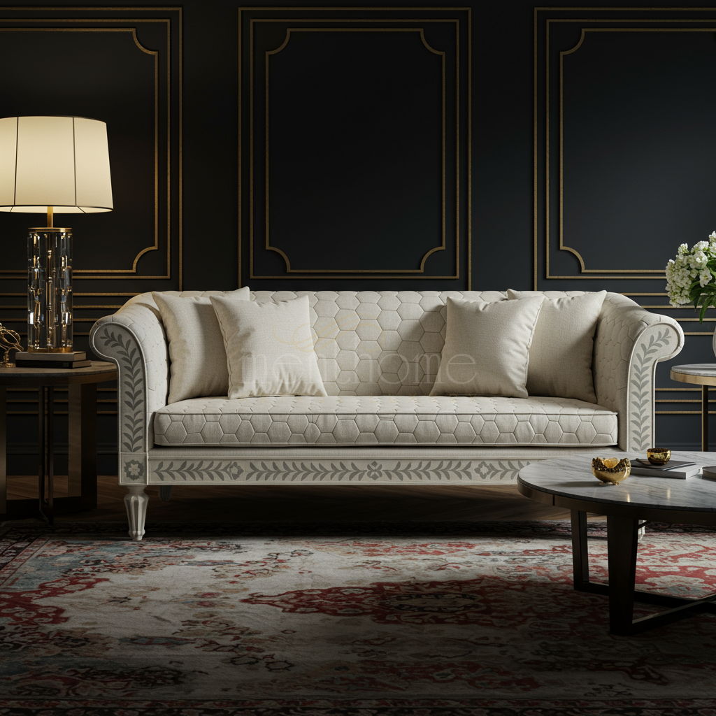 This elegant inlay sofa combines classic craftsmanship with luxurious upholstery, featuring a soft beige fabric adorned with subtle hexagonal quilting and intricate floral inlay details along the base and arms. Perfectly suited for sophisticated living rooms, it offers comfort alongside timeless design.