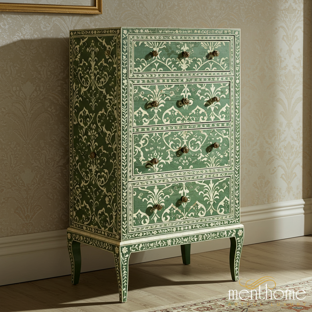 خزانة أدراج طويلة فاخرة مصنوعة يدويًا بنقشة زهور خضراء