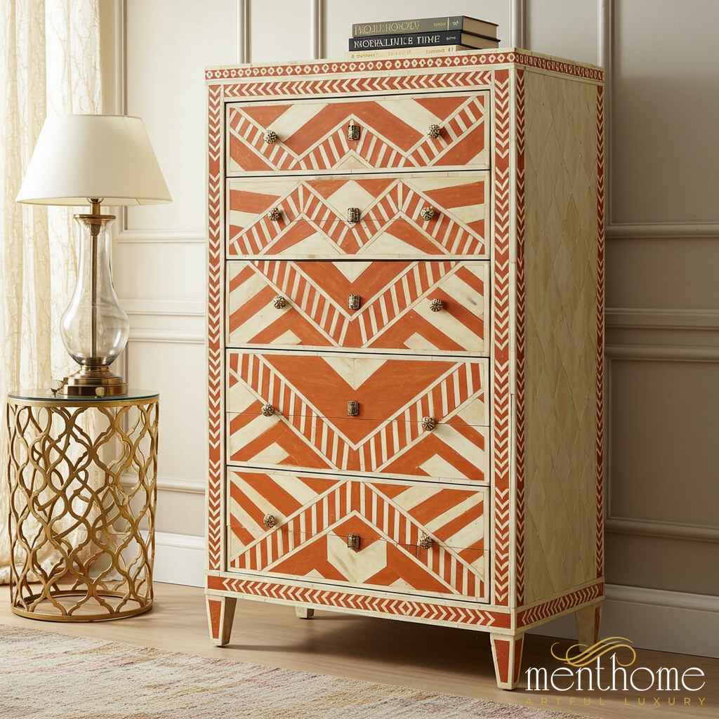 خزانة أدراج خشبية جميلة مطلية يدويًا بنمط هندسي مميز بألوان تراكوتا دافئة وكريمية. تجمع هذه القطعة بين الحرفية الفنية ومساحة التخزين العملية، مما يجعلها مثالية لإضفاء لمسة مميزة على أي غرفة.