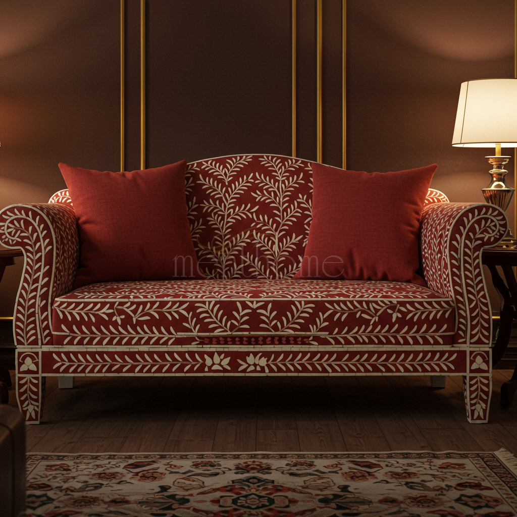 Handcrafted Red Inlay Sofa with Leaf Motif | Luxury Handmade Sofa