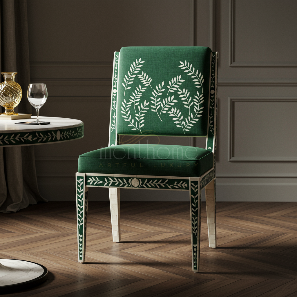 The Inlay Chair features an exquisite botanical design with crisp white leaf patterns on a rich green velvet upholstery. The chair frame is beautifully crafted with matching inlay detailing, blending artistry and luxury seamlessly for an elegant seating option.