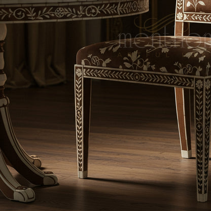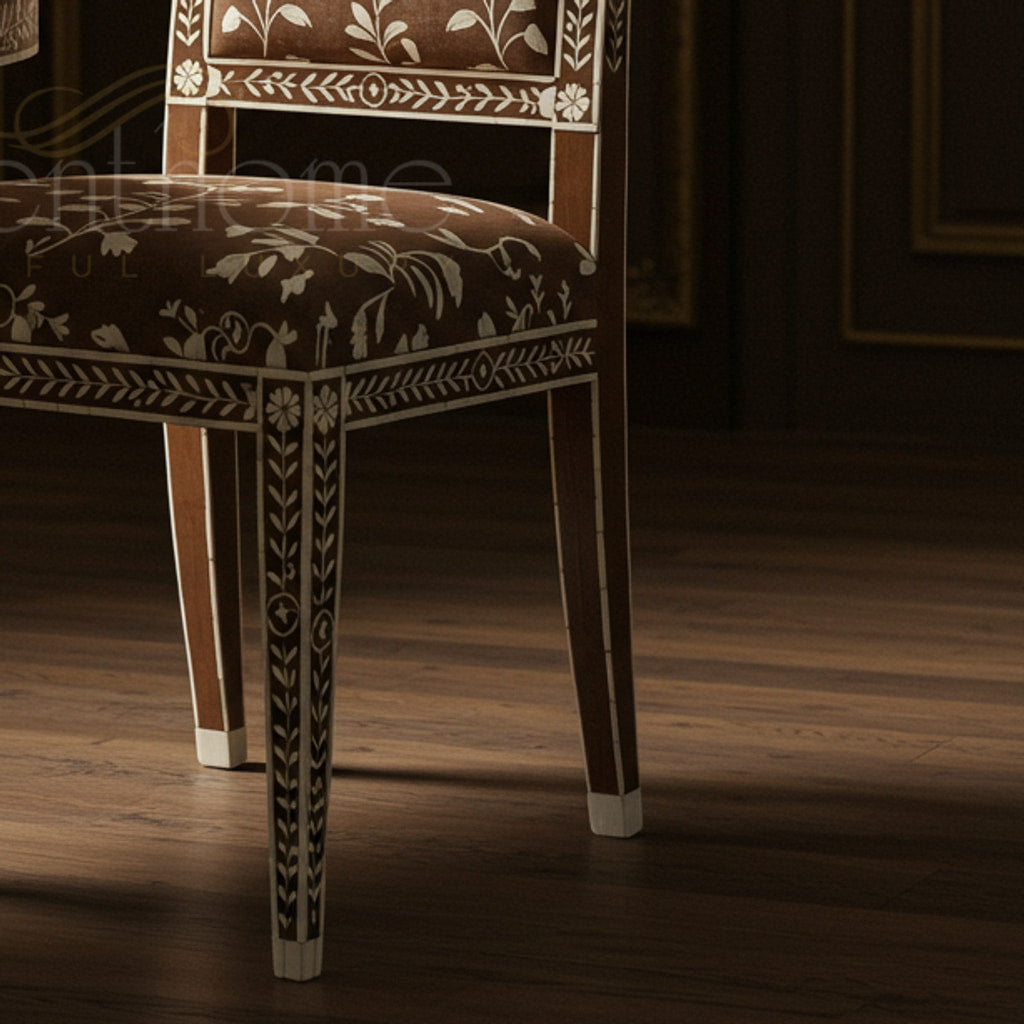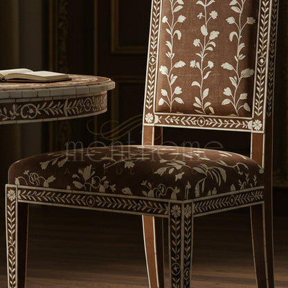 A luxurious inlay chair featuring elegant floral patterns on a rich brown upholstery complemented by detailed inlay work on its wooden frame. This chair exemplifies craftsmanship with intricate floral motifs and sophisticated design, perfect for adding an artistic and refined touch to any dining or living space.