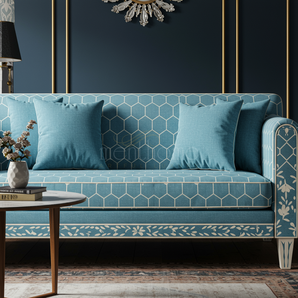 Luxurious Blue Inlay Sofa with Geometric and Floral Motifs | Luxury Handmade Sofa