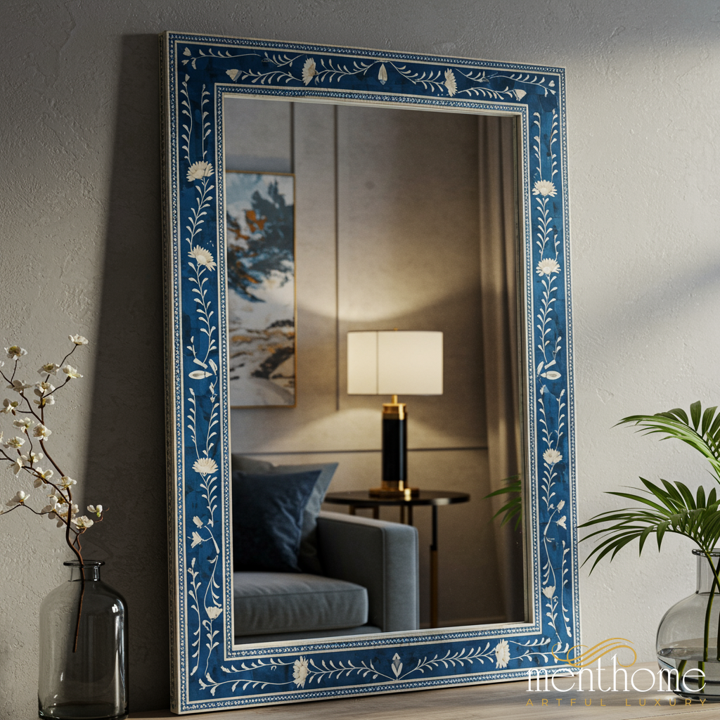 مرآة حائط مزخرفة بنقشة زهور زرقاء | مرآة فاخرة مصنوعة يدويًا