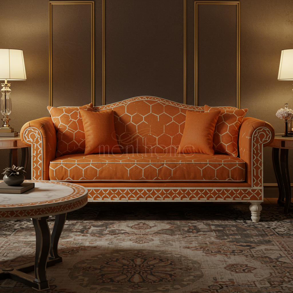 Elegant Orange Inlay Sofa with Geometric Pattern | Luxury Handmade Sofa