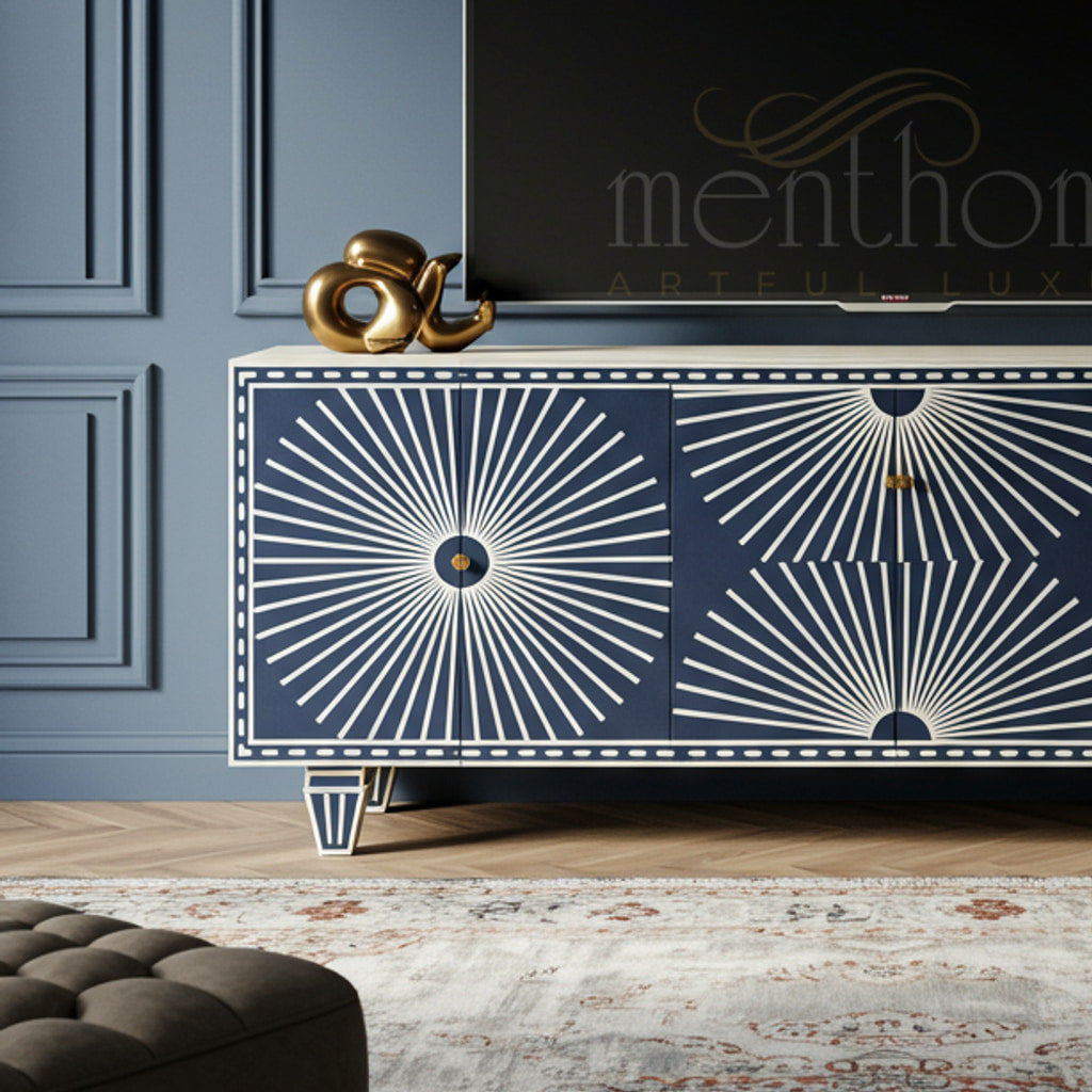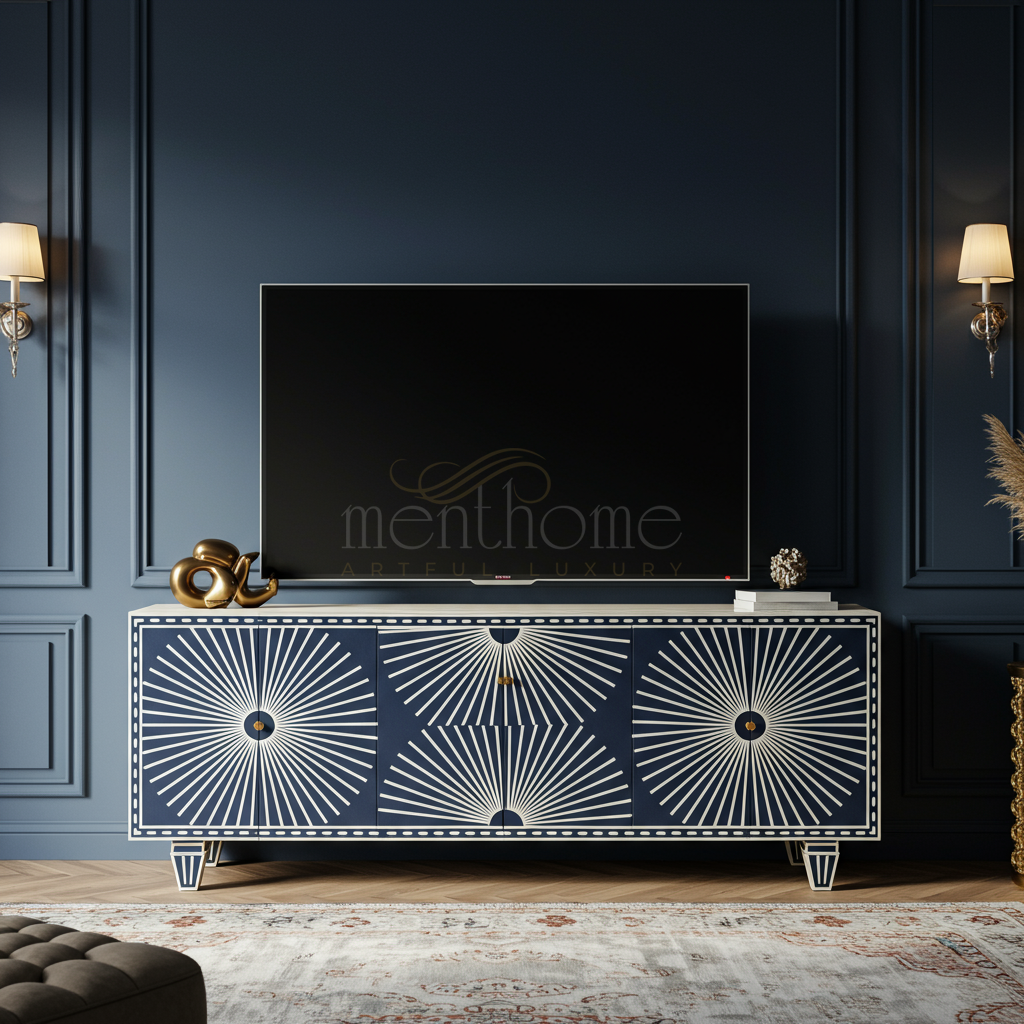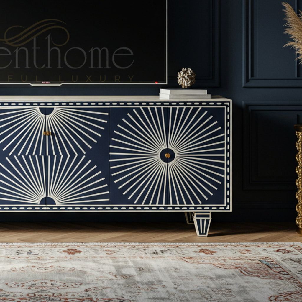 This exquisite inlay TV cabinet features a striking sunburst pattern crafted with meticulous attention to detail. Its elegant navy blue finish accented by white, geometric designs adds a sophisticated statement piece to any living room. Perfectly blending functionality and artistry, it offers ample storage space and elevates your entertainment area with a touch of refined luxury.