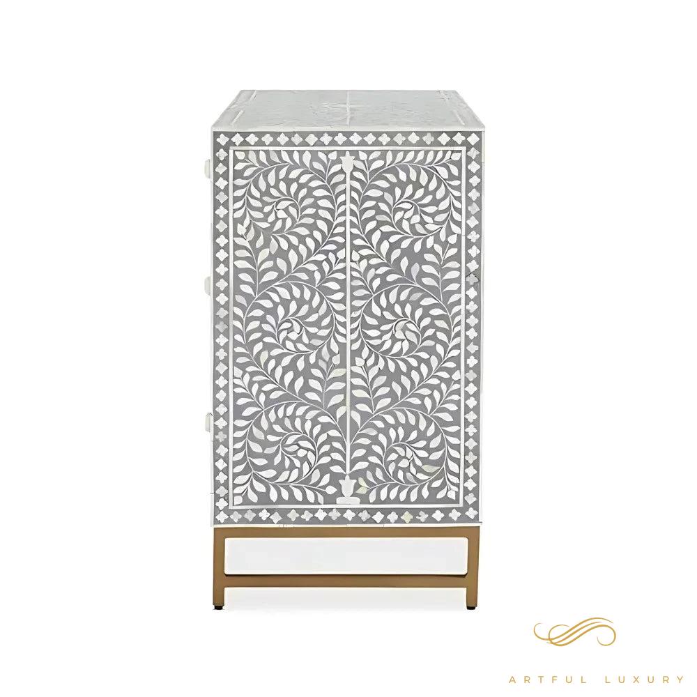 خزانة ملابس صغيرة بثلاثة أدراج مزخرفة بالعظم باللون الرمادي | خزانة ملابس فاخرة مصنوعة يدويًا