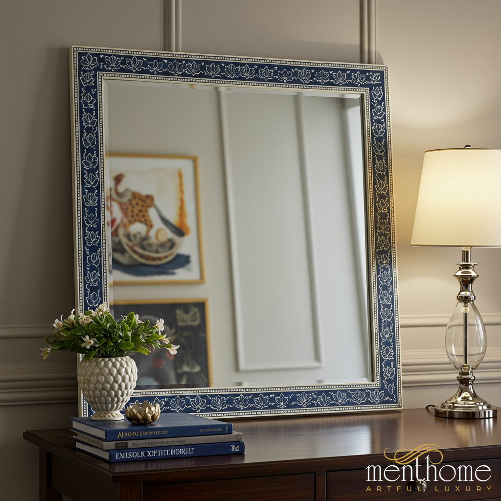 مرآة مربعة أنيقة بإطار أزرق متقن مزين بنقوش زهرية فضية رقيقة. تضفي هذه المرآة المزخرفة لمسة من الأناقة والرقي على أي غرفة، مثالية لغرف النوم، وغرف المعيشة، والممرات.