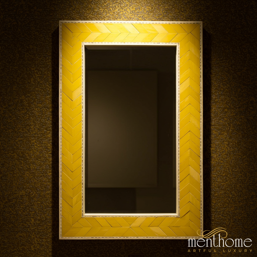 تتميز هذه المرآة المستطيلة الرائعة بإطار ذهبي مبهر، مصممة بنمط شيفرون أنيق، مما يضفي لمسة من الرقي على أي غرفة. مثالية لإضفاء لمسة جمالية على غرفة معيشتك أو ردهتك.