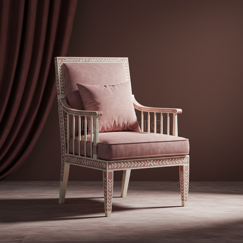 This exquisite Inlay Chair combines classic craftsmanship with contemporary elegance. Featuring intricate inlay detailing on the frame complemented by soft, blush velvet cushions, this chair offers both style and comfort. Its graceful design enhances any living space or lounge area with a touch of refined luxury.