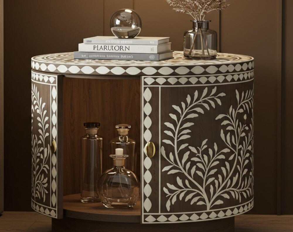 طاولة جانبية مصنوعة يدويًا من عظام مرصعة مع تخزين للزجاجات