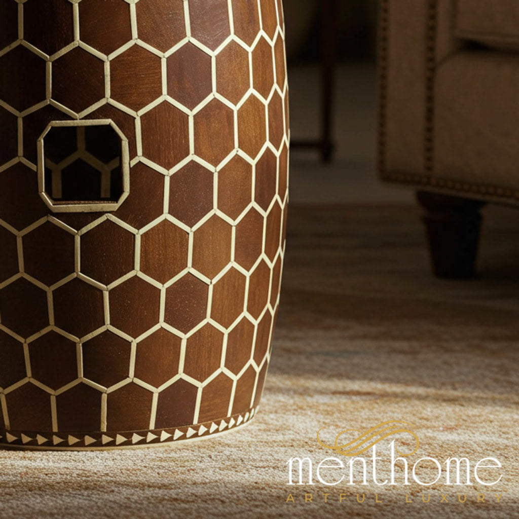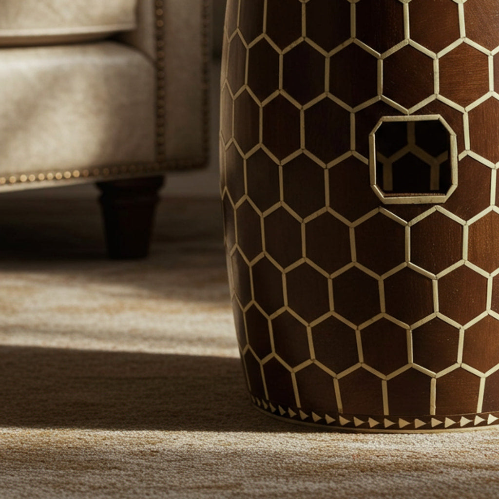 كرسي حديقة خشبي مصنوع بإتقان، يتميز بتصميم سداسي متقن. شكله الأسطواني ولونه البني الغني يضفي لمسة من الأناقة والدفء على أي مساحة داخلية أو خارجية.