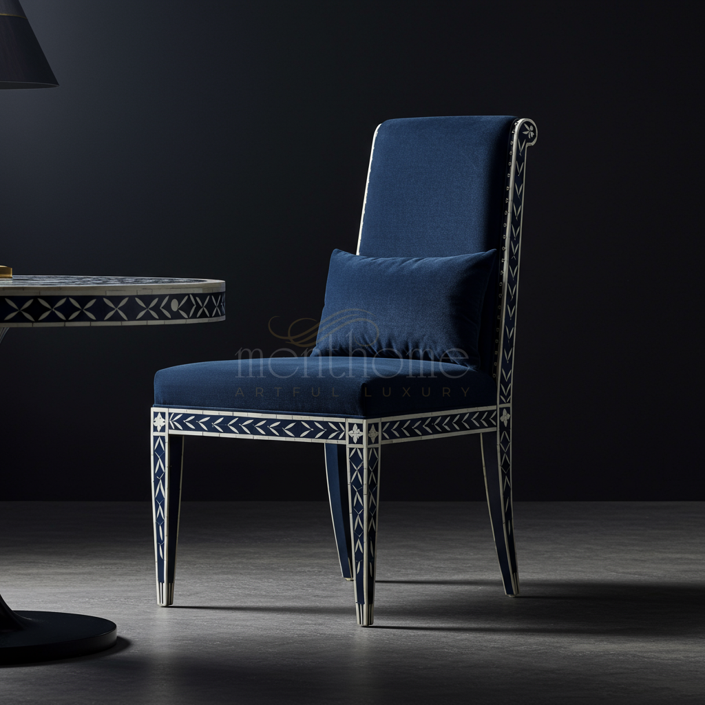 This elegant Inlay Chair features intricate hand-crafted inlay detailing on a solid frame, paired with plush navy blue upholstery for a luxurious seating experience. The chair blends artisan craftsmanship with modern comfort, making it a perfect addition to refined interiors.