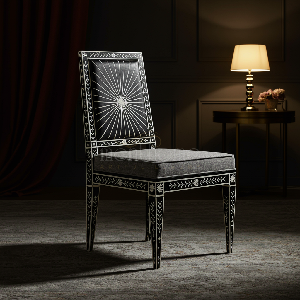 Experience timeless elegance with this Inlay Chair, featuring intricate hand-crafted bone inlay work on a rich black wooden frame. The high-back showcases a stunning sunburst pattern, paired with a comfortable grey upholstered cushion for both style and comfort. Perfect for luxury dining rooms or sophisticated seating areas.