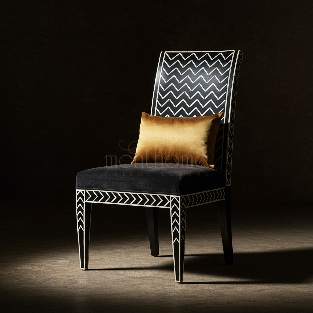 This exquisite Inlay Chair features a striking black and white chevron pattern inlaid meticulously along its frame and backrest, paired with a plush black upholstered seat and a luxurious golden velvet cushion. Designed for a stylish and sophisticated ambiance, it blends traditional craftsmanship with contemporary elegance, making it a statement piece in any living room or office.