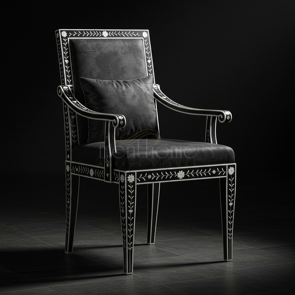 This exquisite luxury armchair features a finely crafted black frame adorned with intricate white floral inlay designs. The plush black upholstered seat and backrest, complemented by a matching cushion, offer both comfort and elegance. Perfect for sophisticated living spaces, this chair combines artistic craftsmanship with premium materials to create a statement piece.