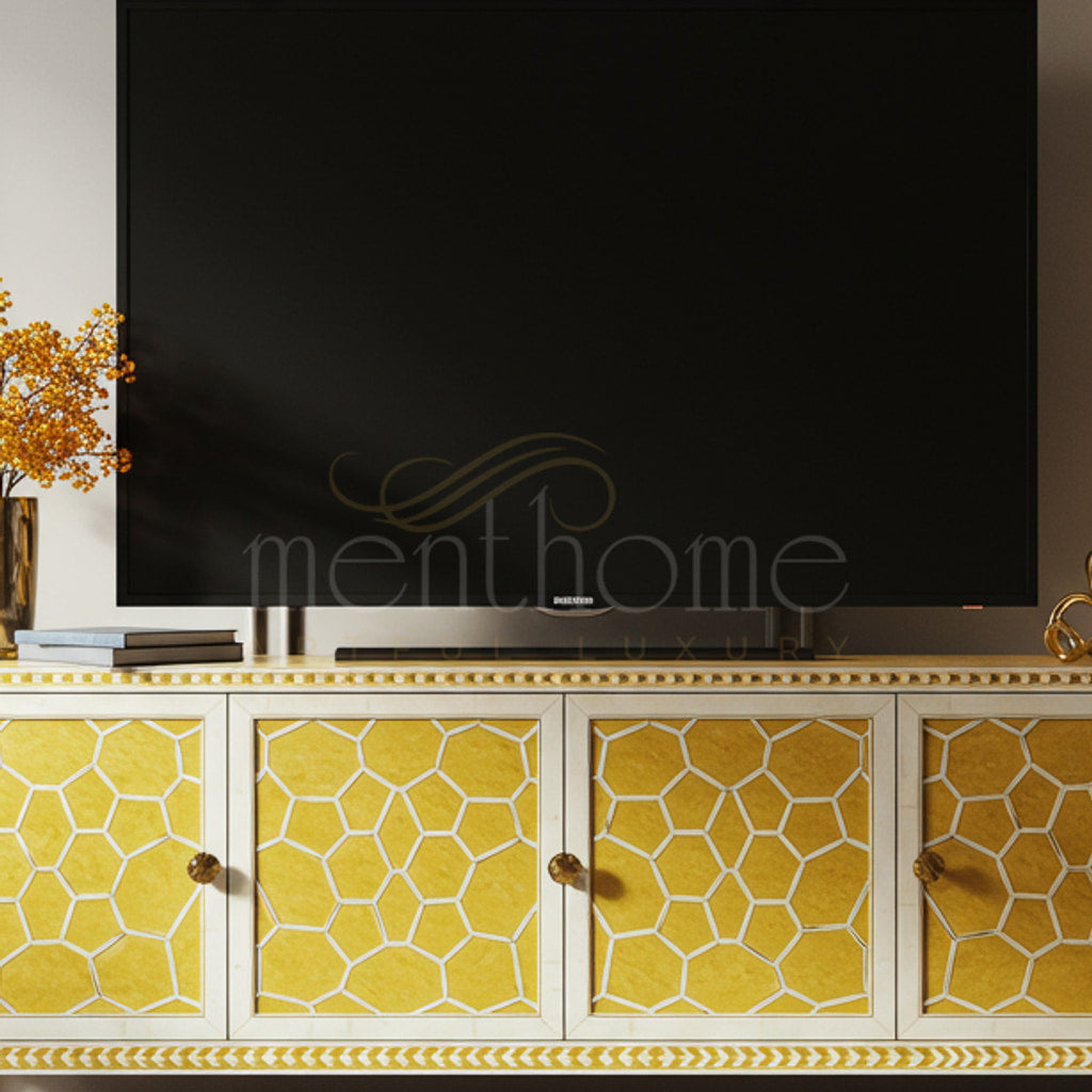 This elegant TV cabinet features intricate inlay work with a standout geometric pattern in warm yellow tones. Crafted to blend functionality with artistic design, it provides ample storage space with four spacious doors, perfect for organizing media accessories while enhancing your living room decor.