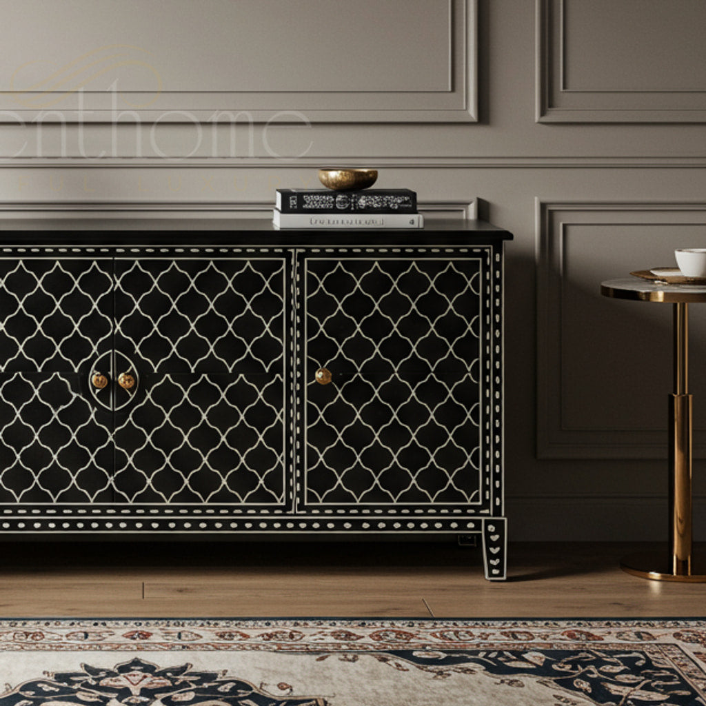 This luxury inlay TV cabinet features elegant black finishing with intricate geometric inlay patterns, blending traditional craftsmanship with modern sophistication. Designed to provide ample storage and style, it is a perfect centerpiece for any upscale living room or entertainment space.