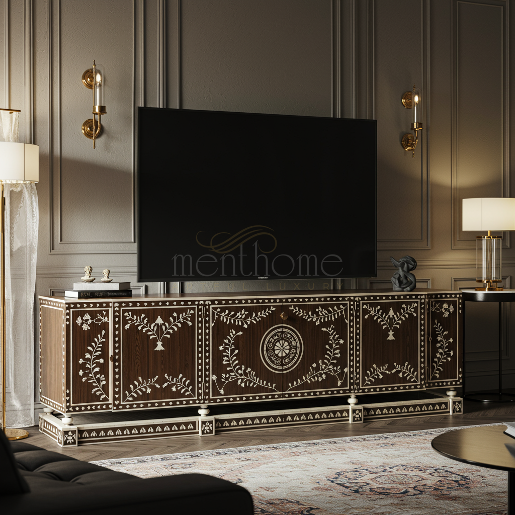 This exquisite luxury TV cabinet features beautifully handcrafted inlay work with intricate floral designs, set against a rich dark wood finish. Designed to be a centerpiece in any refined living space, it balances classical elegance with functional storage.