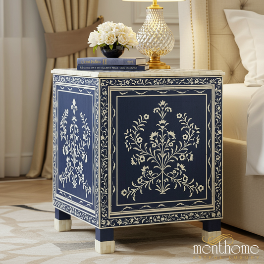 Blue Floral Bone Inlay Bedside Table | Luxury Handmade Bedside Table