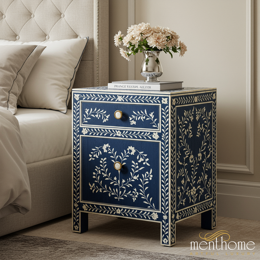 Add a touch of elegance to your bedroom with our artisan-crafted bone inlay bedside tables and mother of pearl nightstands. Each table is skillfully handmade with delicate inlay patterns, sturdy wood, and polished finishes, offering both storage and style. Designed for modern interiors, our bedside tables bring sophistication to any space while supporting fair-trade artisan communities through sustainable practices. With unique patterns, premium craftsmanship, and exceptional customer care, these inlay nightstands redefine bedroom luxury.