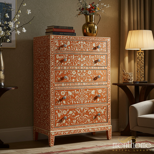 Handcrafted Red Bone Inlay Floral Pattern Tall Chest of Drawers | Luxury Handmade Tallboy