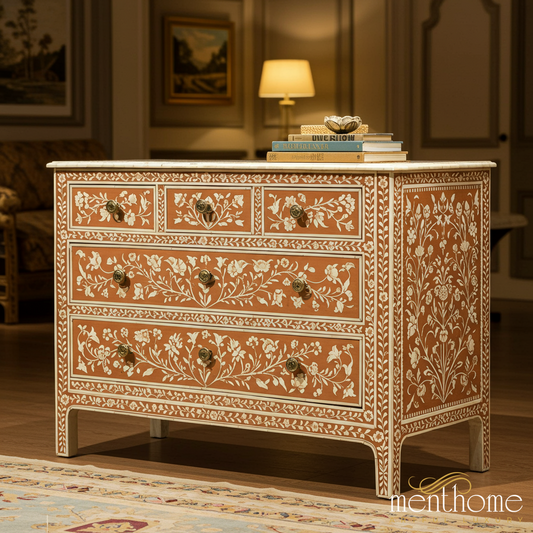 Elevate your interiors with our bone inlay chest of drawers and mother of pearl dressers, where timeless artistry meets everyday utility. Each piece is meticulously handcrafted by artisans who skillfully arrange delicate inlay patterns into durable wood, creating furniture that is both functional and decorative. With spacious drawers for organized storage and designs that double as statement décor, these chests are perfect for bedrooms, living rooms, or hallways. Every purchase supports artisan communities through fair wages and sustainable practices, while our focus on premium craftsmanship, customizable designs, and dedicated customer service ensures your chest of drawers is as meaningful as it is luxurious.