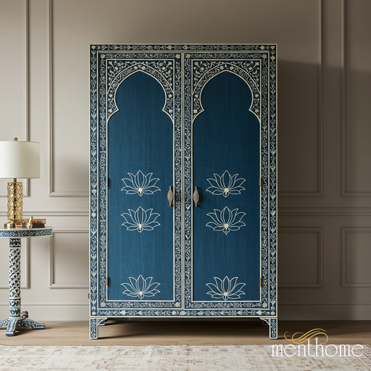 Handcrafted Blue Lotus Inlay Wooden Wardrobe | Luxury Handmade Wardrobe