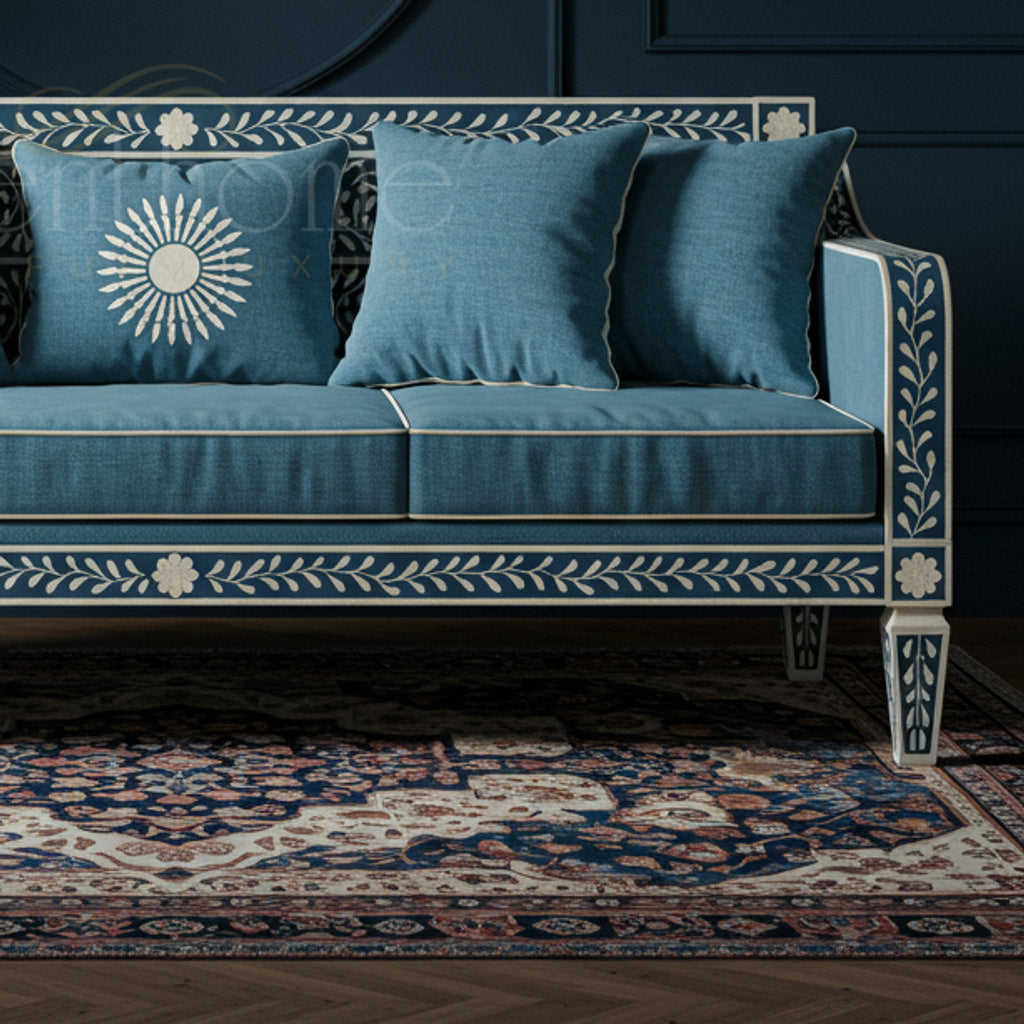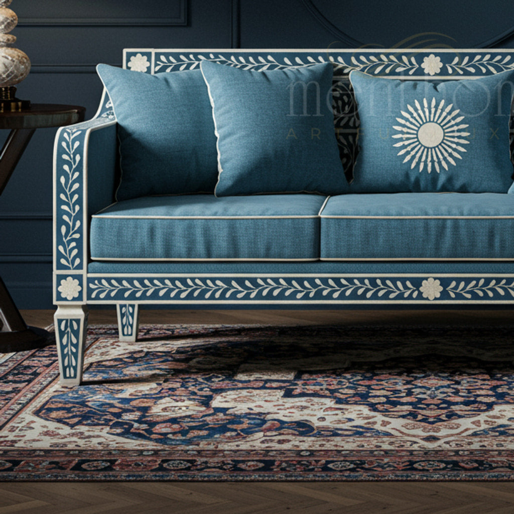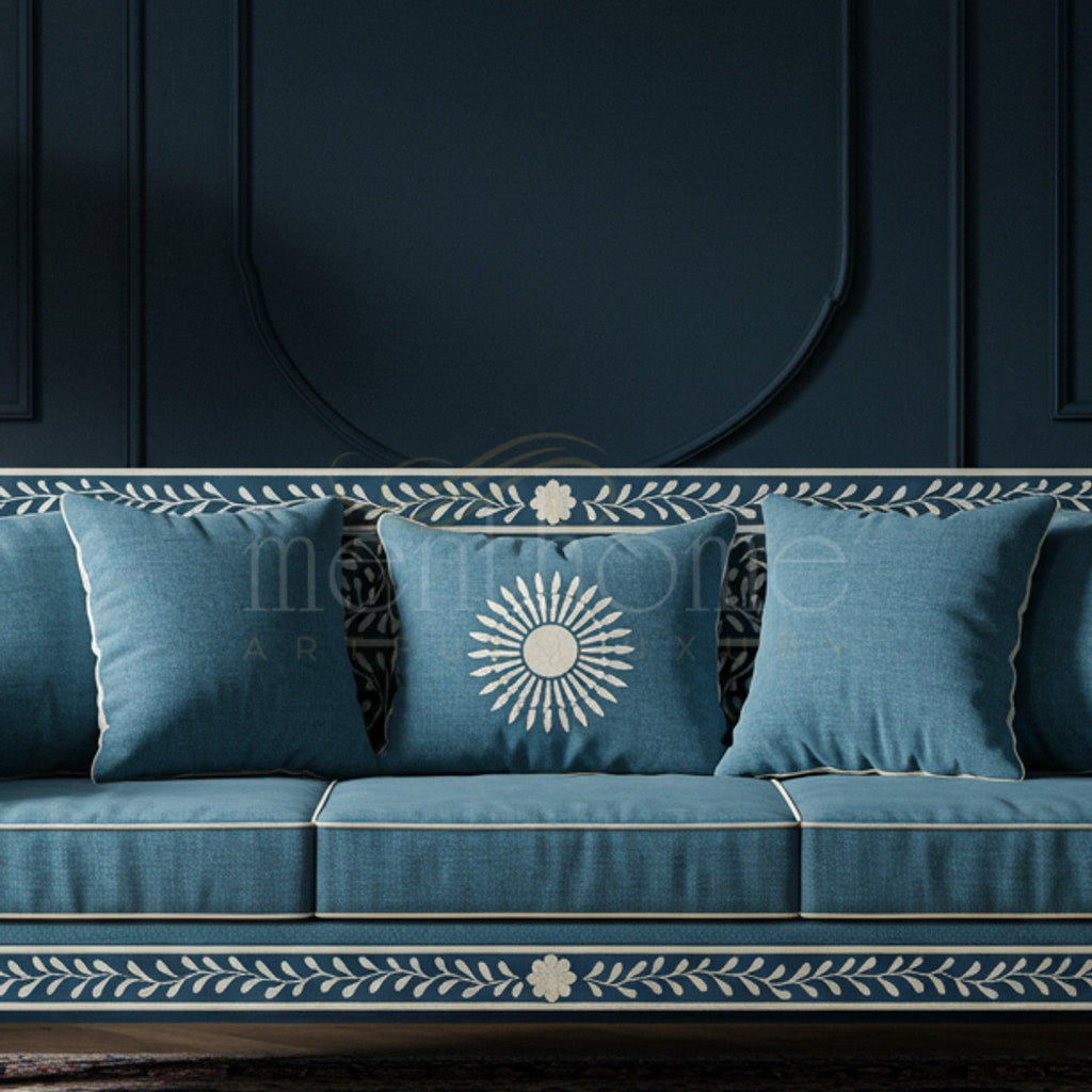 Elegant Blue Inlay Sofa with Floral Motifs | Luxury Handmade Sofa
