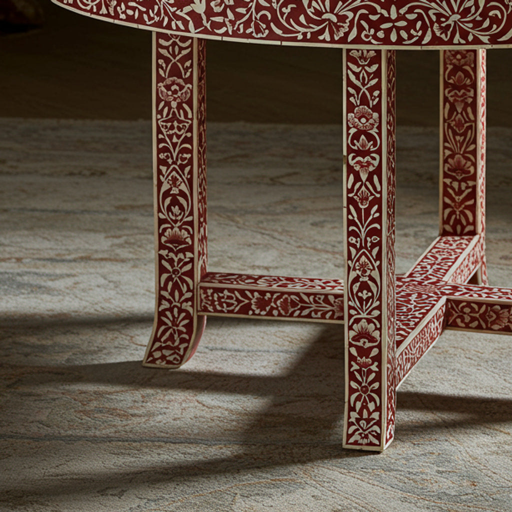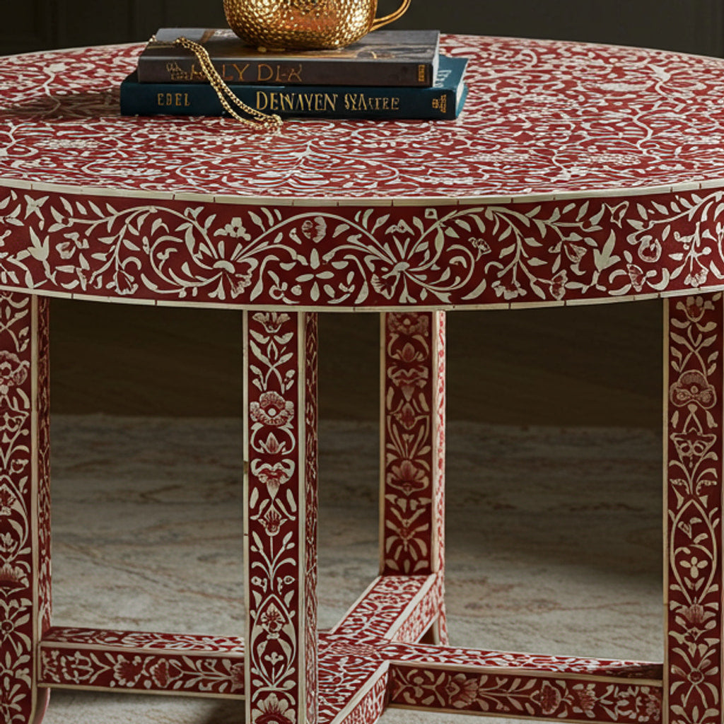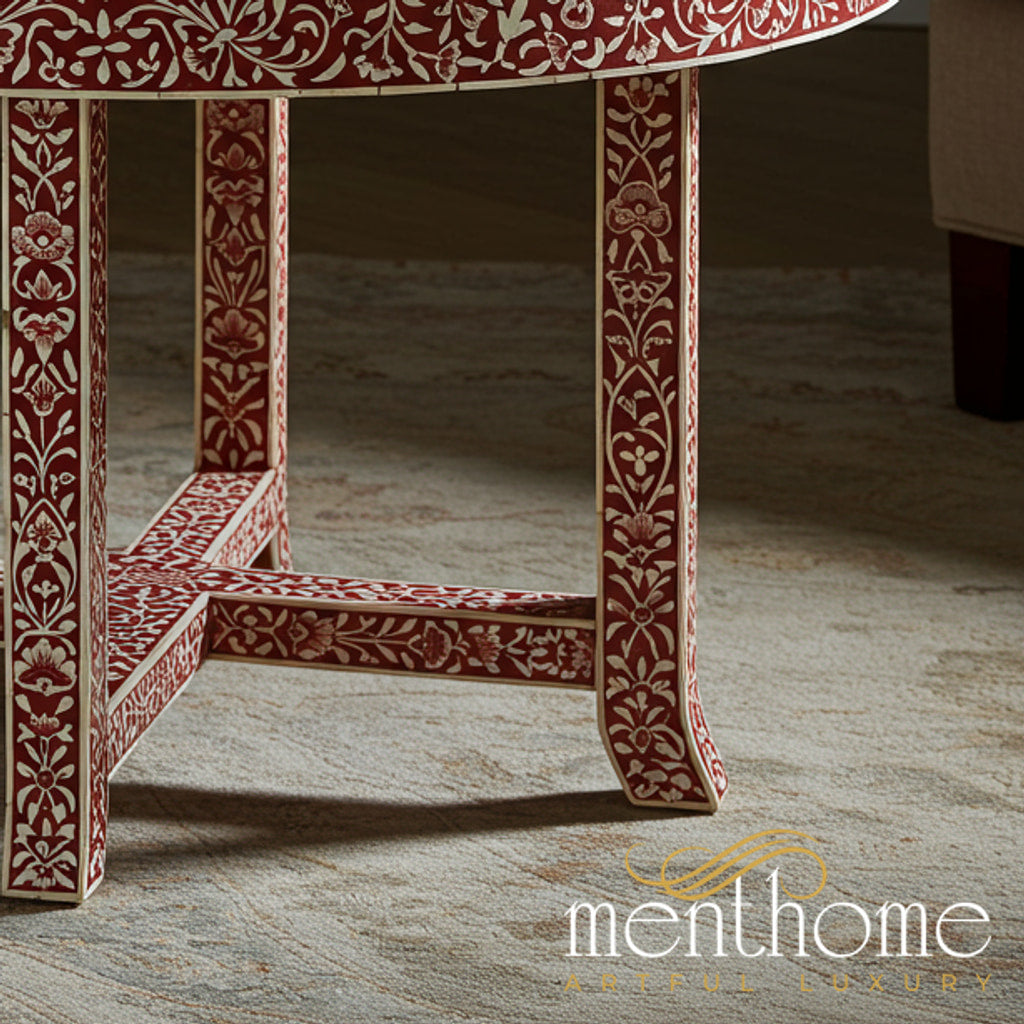 Handcrafted Red and White Floral Inlay Round Coffee Table | Luxury Handmade Coffee Table