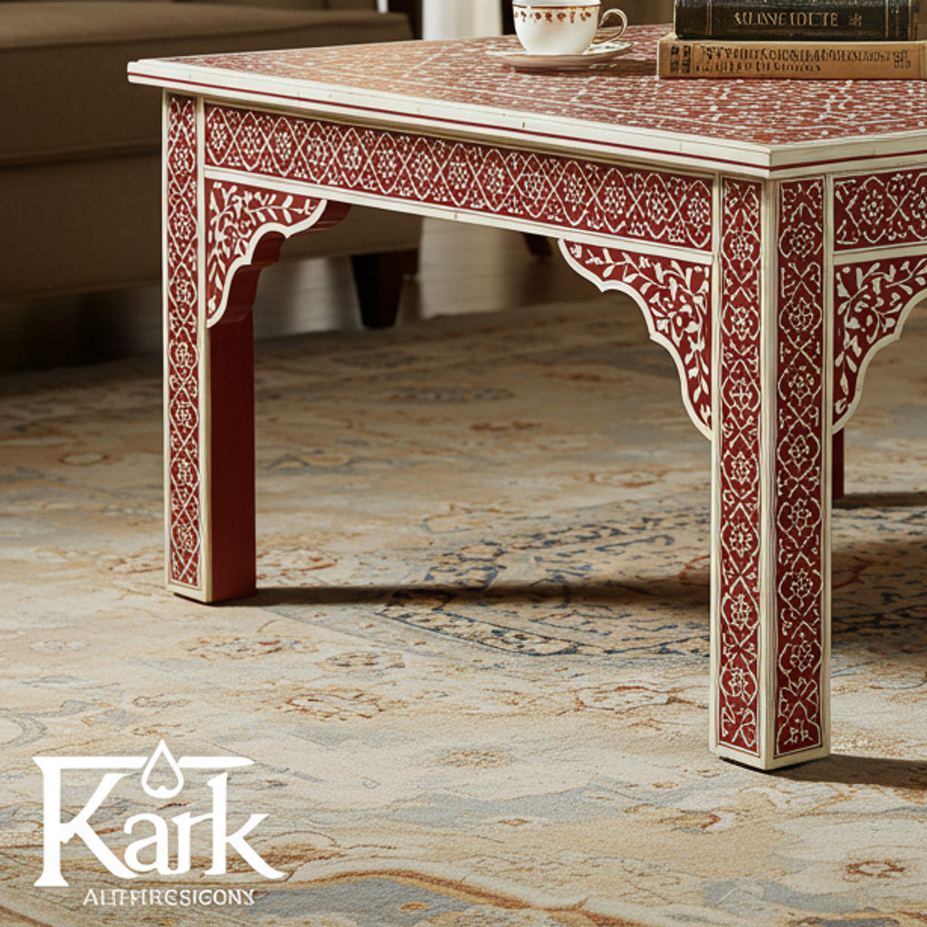 An exquisite handcrafted coffee table featuring intricate red and white inlay designs. Perfect for adding a touch of elegance and traditional artistry to your living room or lounge area.