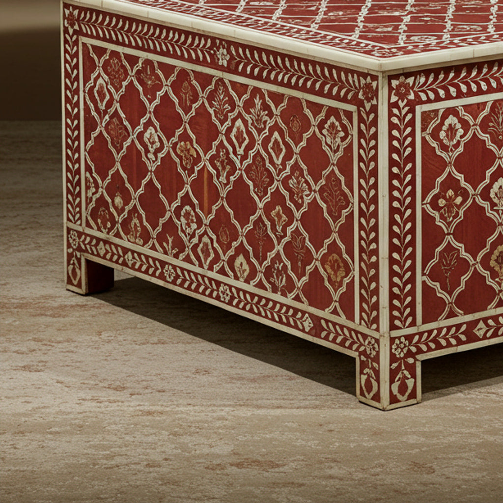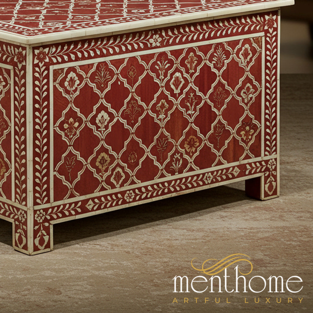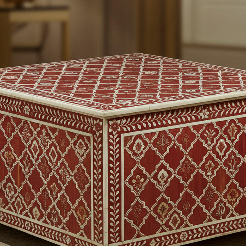 A beautifully handcrafted red coffee table featuring intricate bone inlay designs. This square table adds a touch of elegance and traditional charm to any living space. Perfect for storing essentials or displaying decorative items.