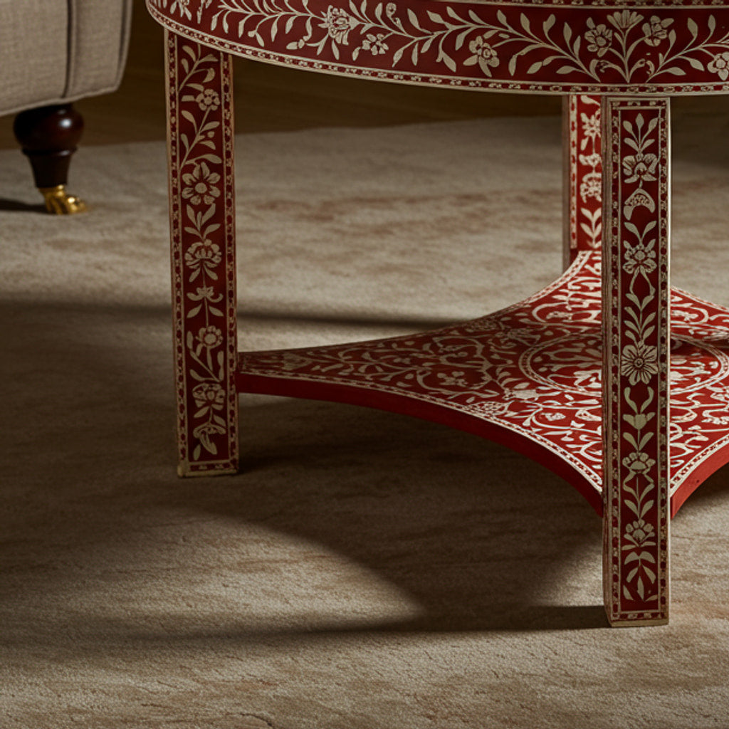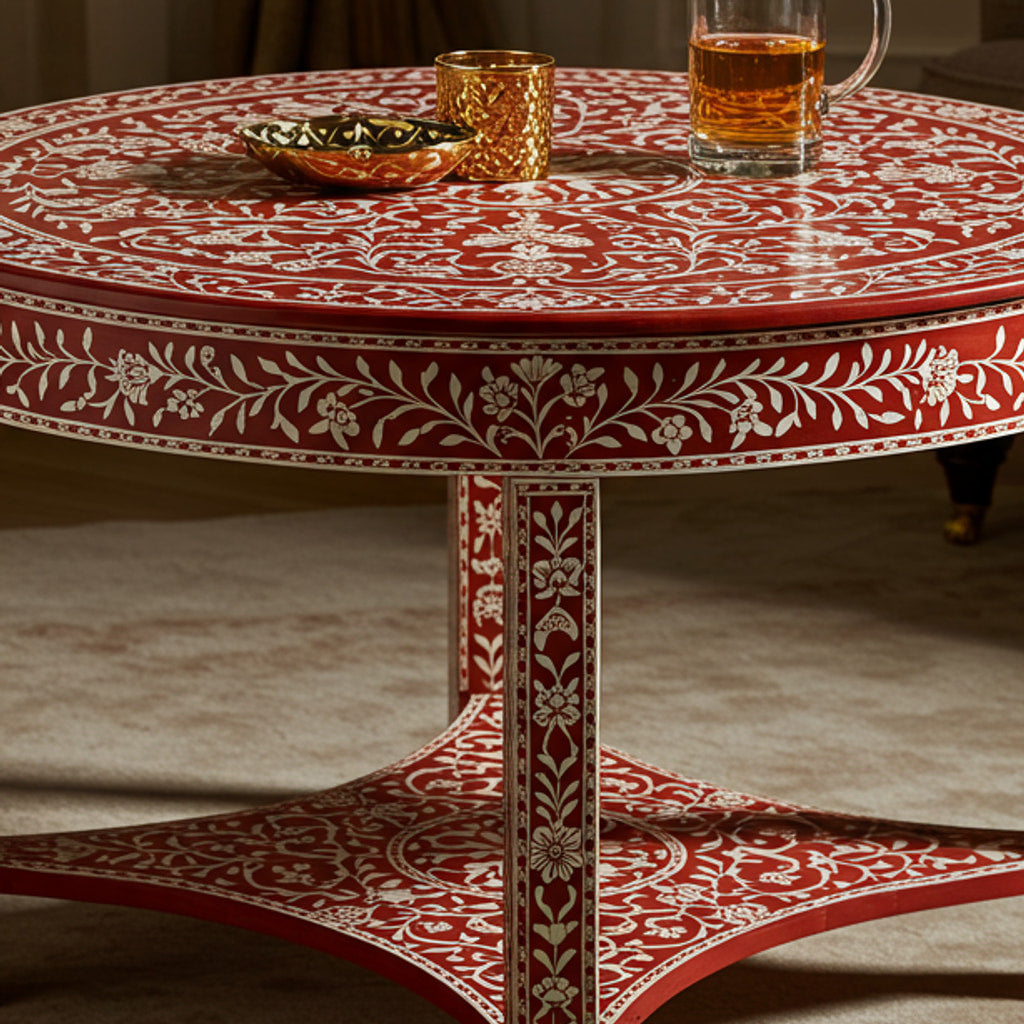 Handcrafted Red Floral Inlay Round Coffee Table | Luxury Handmade Coffee Table