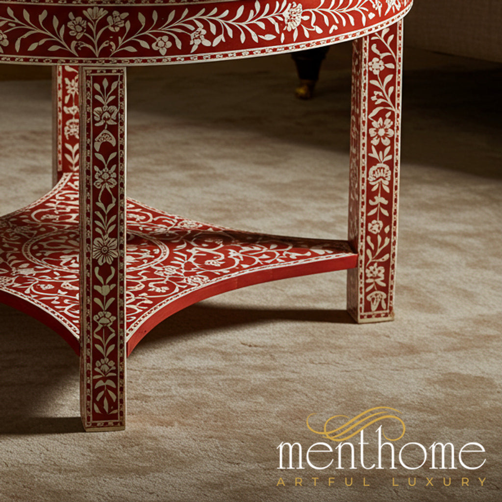 This exquisite round coffee table features intricate white floral inlay over a vibrant red base, adding a touch of elegance and artistry to your living space. Perfectly sized for lounging areas, it offers both beauty and functionality.