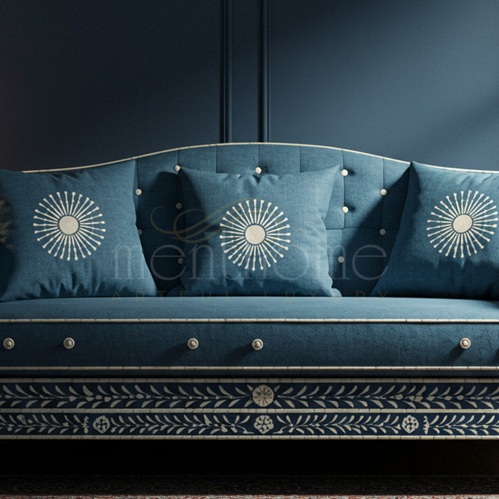 Luxury Blue Inlay Carved Sofa with Decorative Cushions | Luxury Handmade Sofa