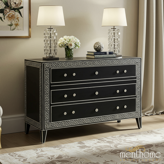 Black and White Floral Inlay Wooden Dresser | Luxury Handmade Chest of Drawer