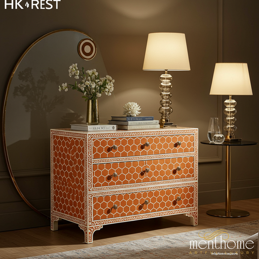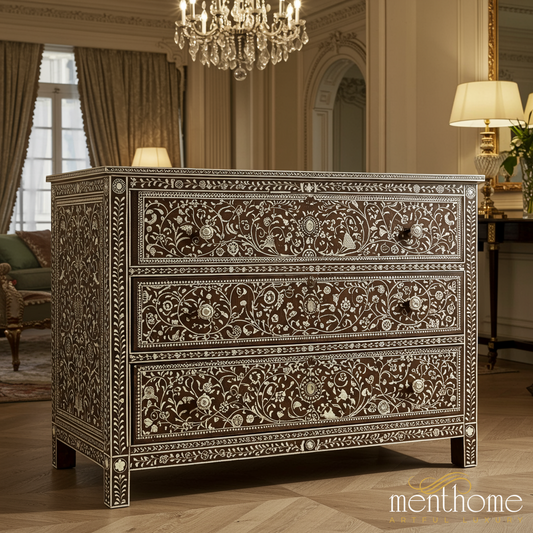 Elevate your interiors with our bone inlay chest of drawers and mother of pearl dressers, where timeless artistry meets everyday utility. Each piece is meticulously handcrafted by artisans who skillfully arrange delicate inlay patterns into durable wood, creating furniture that is both functional and decorative. With spacious drawers for organized storage and designs that double as statement décor, these chests are perfect for bedrooms, living rooms, or hallways. Every purchase supports artisan communities through fair wages and sustainable practices, while our focus on premium craftsmanship, customizable designs, and dedicated customer service ensures your chest of drawers is as meaningful as it is luxurious.