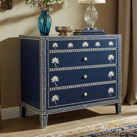 Navy Blue Floral Inlay Three-Drawer Dresser | Luxury Handmade Chest of Drawer
