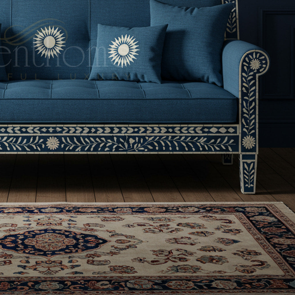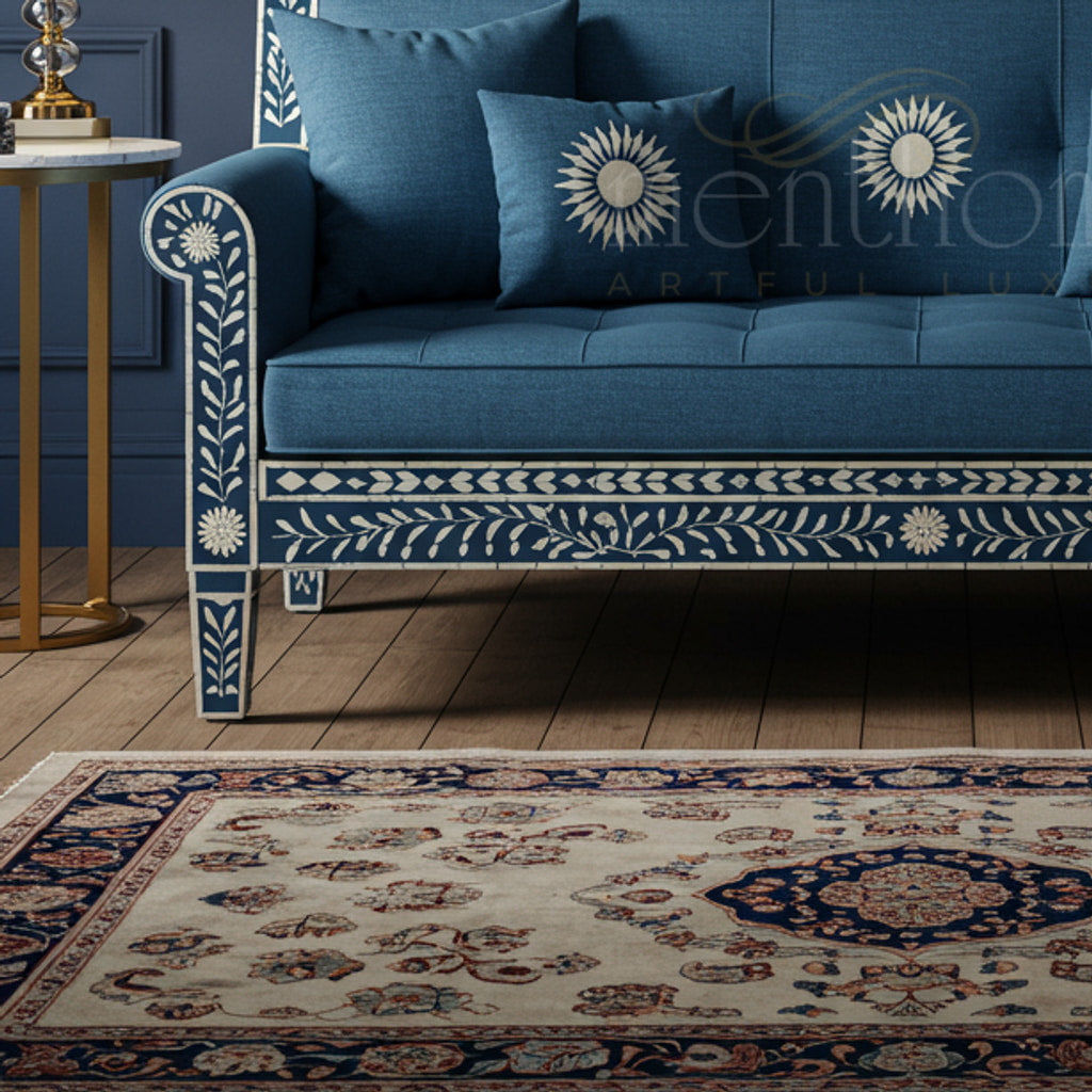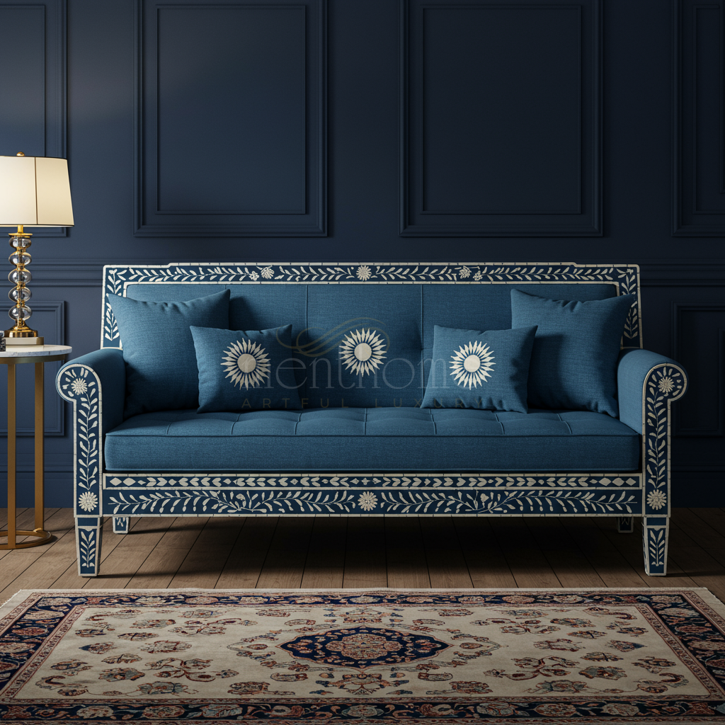 Elegantly crafted in an artisanal style, this inlay sofa features a rich blue fabric upholstery complemented by intricate white floral and leaf pattern inlays on the wooden frame. Perfect for refined living rooms, this sofa blends classic craftsmanship with luxurious comfort.