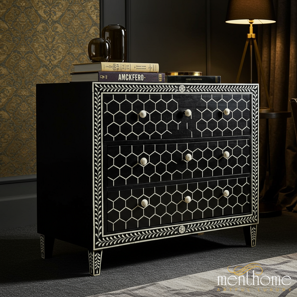 Elegant black chest featuring intricate white bone inlay with hexagonal patterns and delicate border designs. This stylish three-drawer chest adds a sophisticated touch to any room, providing ample storage space for your essentials.