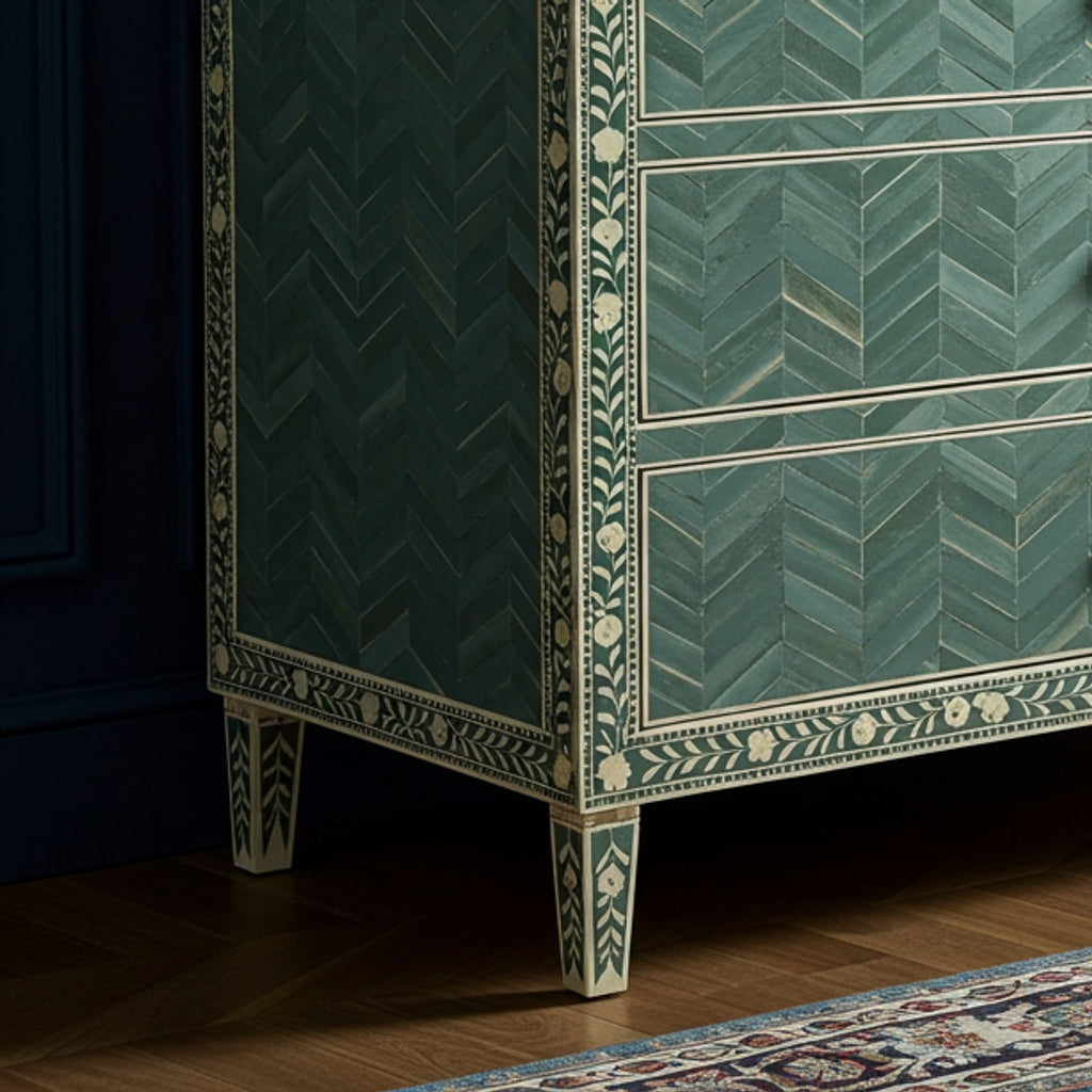 Elegant three-drawer chest featuring intricate geometric inlay patterns and floral border detailing. Crafted to add style and storage to any living space with quality and finesse.