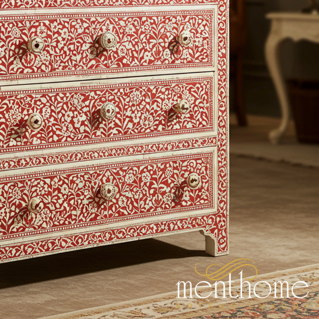 A beautifully handcrafted wooden chest of drawers featuring intricate red and white floral patterns. This piece combines traditional artistry with functional storage, perfect for adding a touch of elegance to any room.